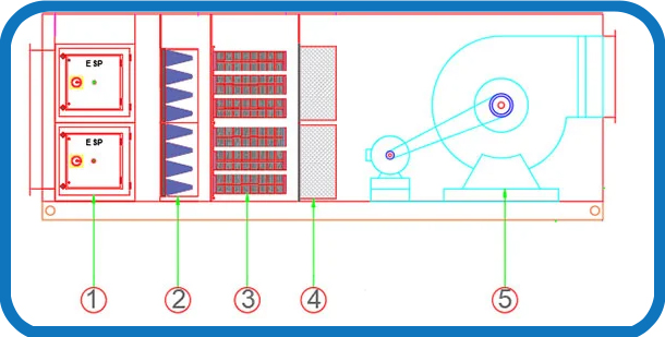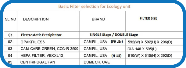 Dumech ecology units use various stages of filtration in our system including ESP, Bag filters, Activated Carbon Filters, UVC, HEPA, and water spray filter system making 100 % efficient oil and smoke free system.